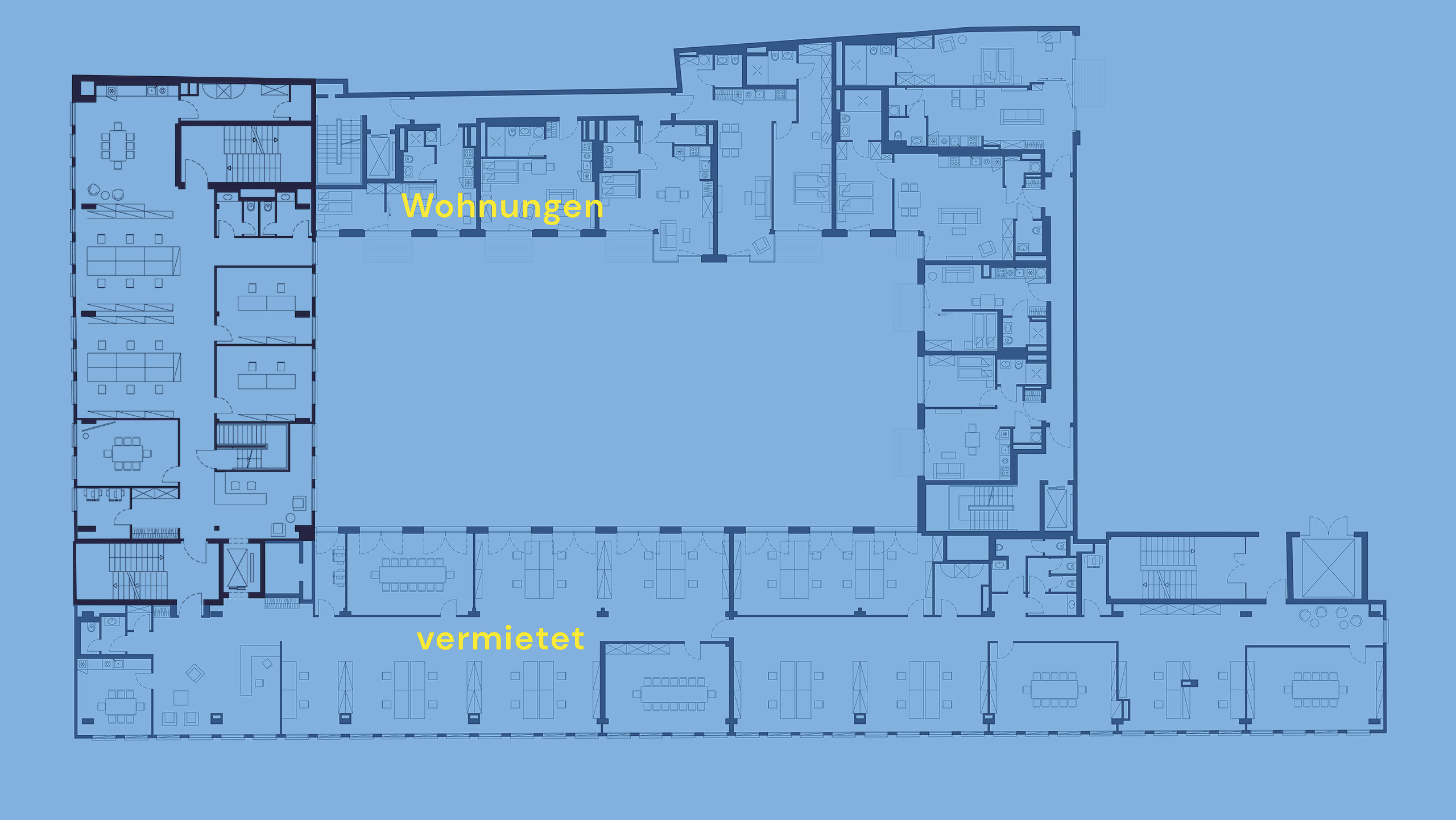 Das Westgebäude erhält durch einen kompletten Umbau sowie eine Erweiterung plus einen Neubau ein umfassendes Makeover. Mit der Erweiterung der Flächen in den Innenhof sowie um ein Staffelgeschoss entsteht eine Gesamtfläche von 7.200 m² für ganz unterschiedliche Nutzungen.